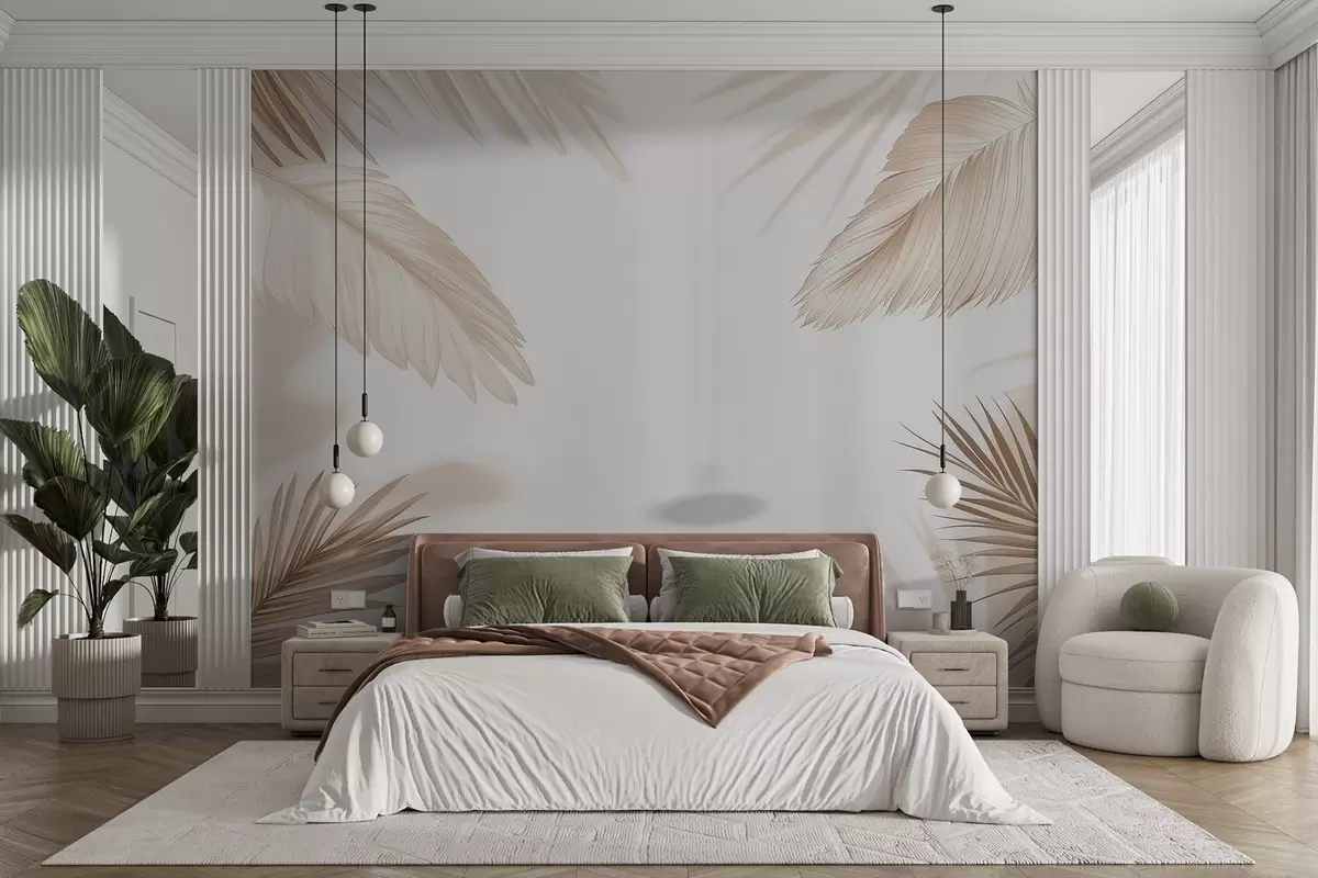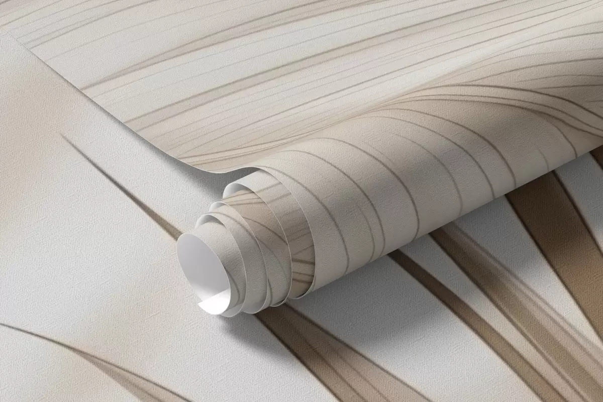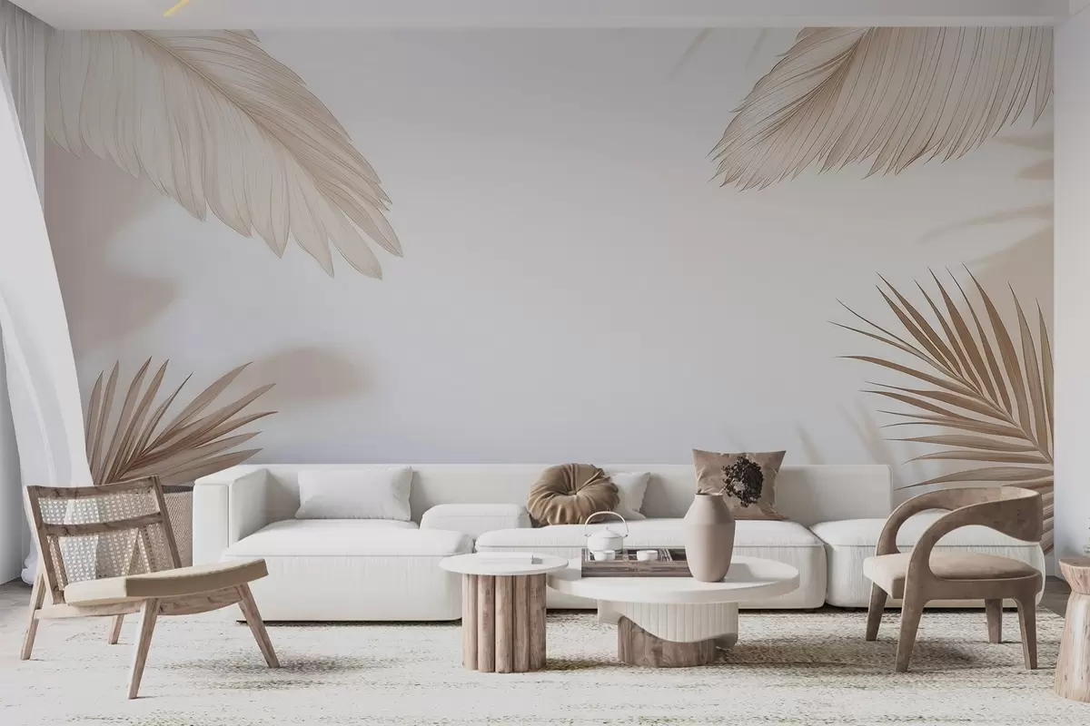 Papel tapiz Decoración tropical en tonos beige con siluetas de hojas de palmera y sombras suaves Nr. w09714