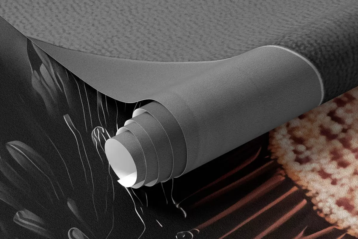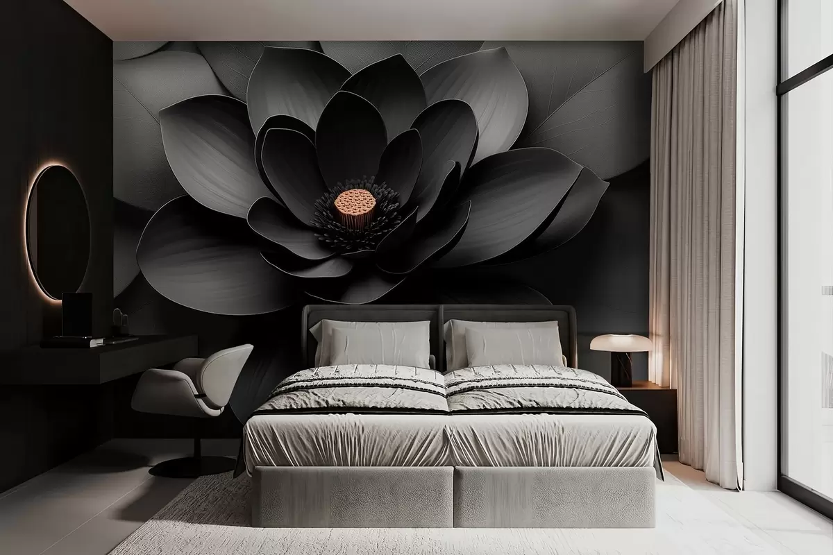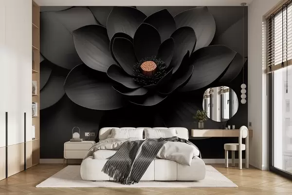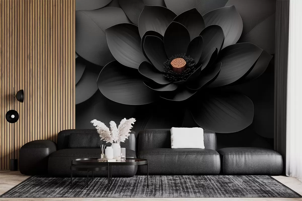Papel tapiz Flor negra minimalista con pétalos y un centro cálido que contrasta Nr. w09721