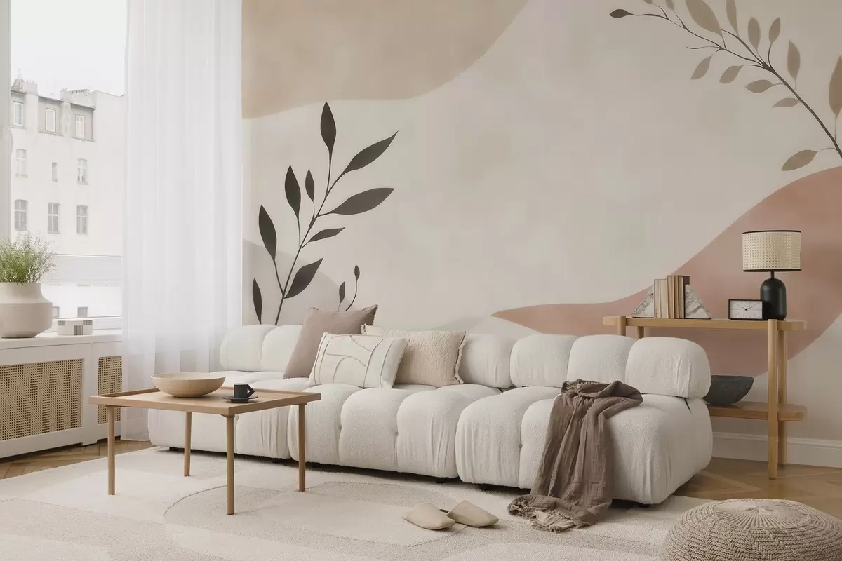 Papel tapiz Olas abstractas en tonos beige y melocotón con ramas Nr. w09722