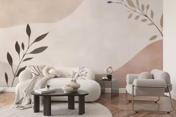 Papel tapiz Olas abstractas en tonos beige y melocotón con ramas Nr. w09722