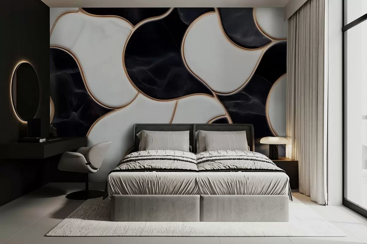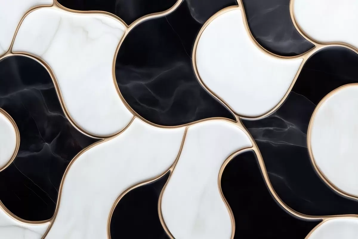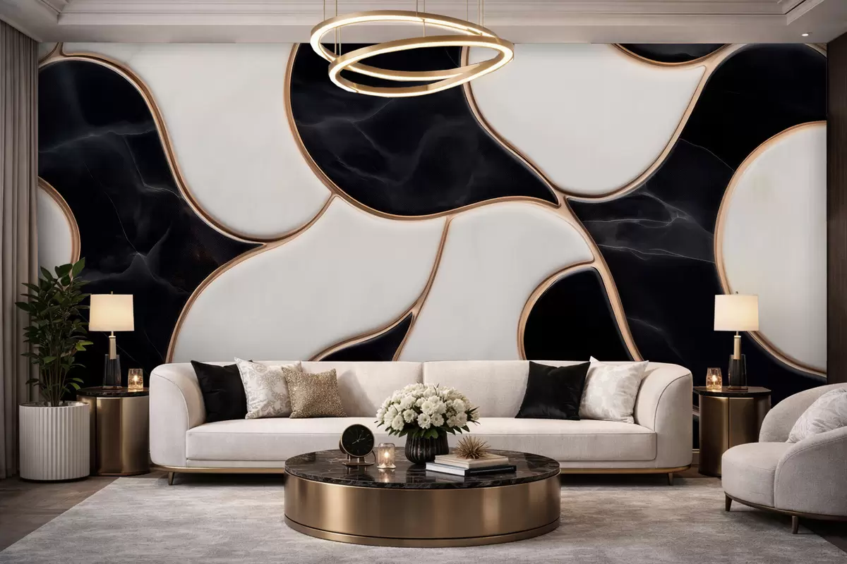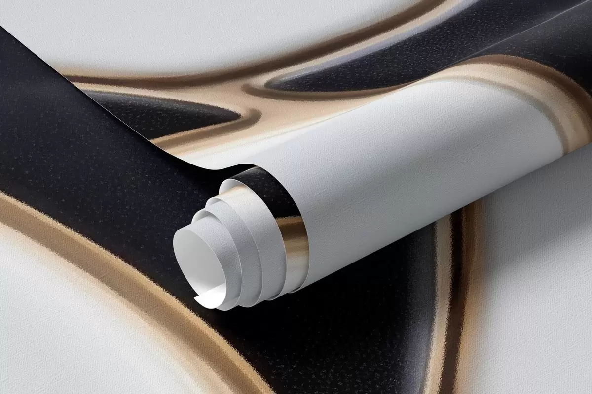 Papel tapiz Imitación abstracta de una composición de mármol en tonos blancos y negros con líneas amarillas Nr. w09733