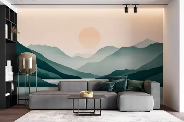 Papel tapiz Tranquilo paisaje montañoso con el sol sobre el lago Nr. w09735