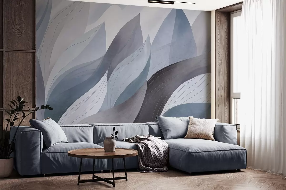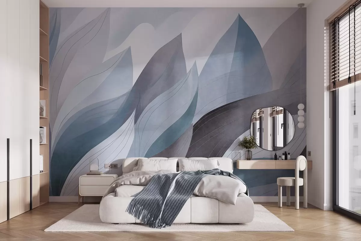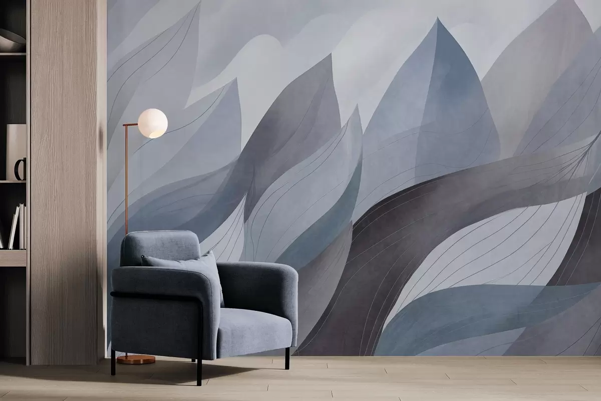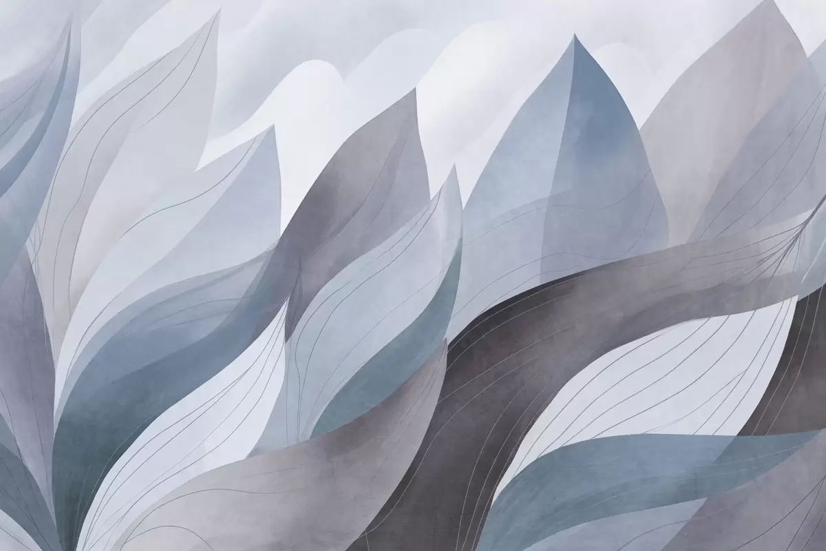 Papel tapiz Hojas abstractas, tonos tierra apagados en azul con delicados detalles lineales, textura suave de acuarela. Nr. w09736v1