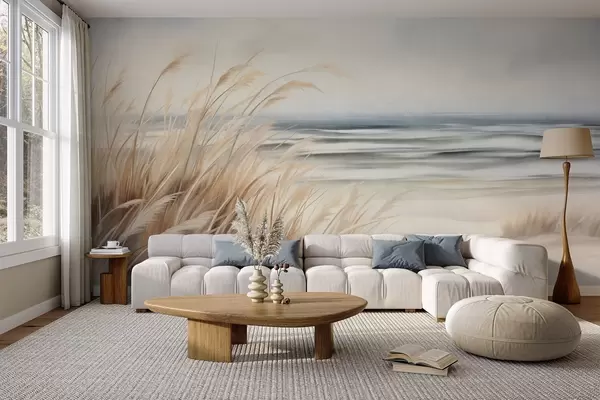 Papel tapiz Paisaje con textura, con hierba seca en una playa de arena, con el océano y el cielo al fondo. Nr. w09739