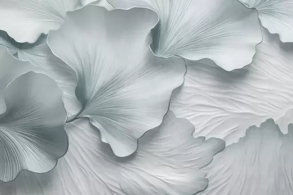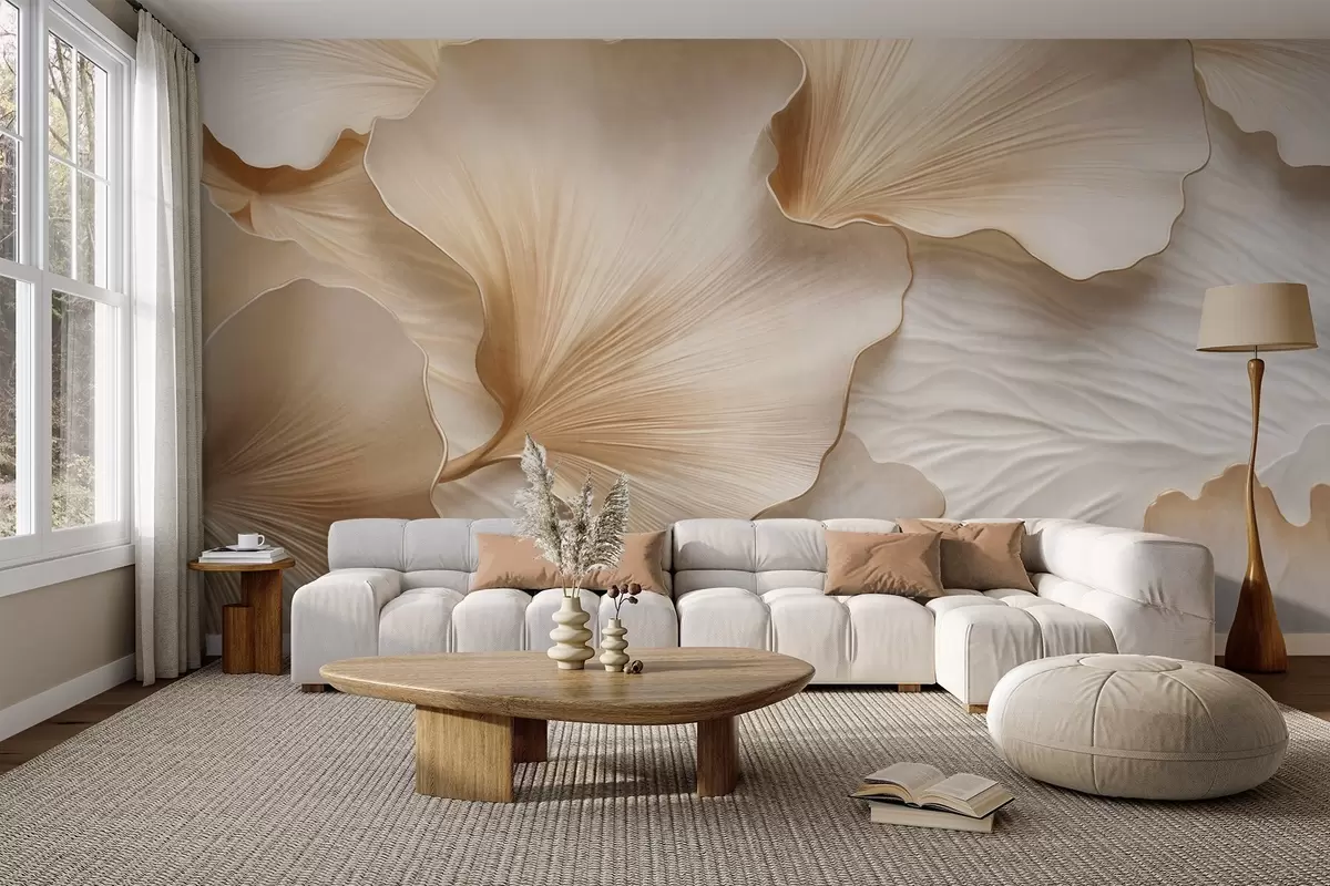 Papel tapiz Pétalos de hojas de ginkgo texturizados, de color beige y blanco, con un delicado estampado orgánico. Nr. w09741
