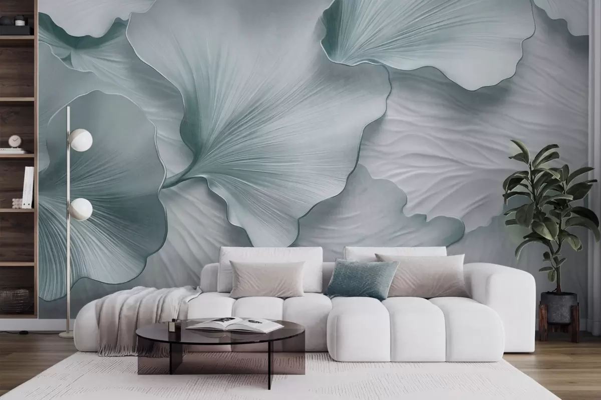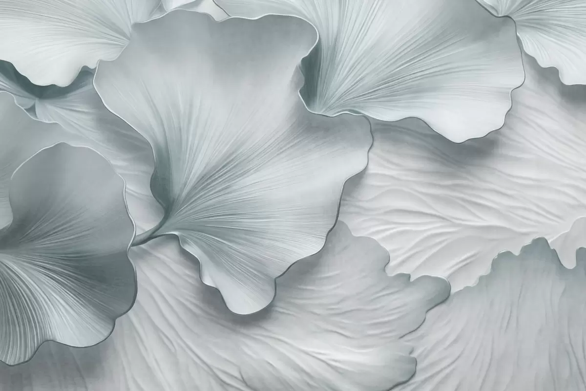 Papel tapiz Pétalos de hojas de ginkgo texturizados, azules y blancos, con un delicado estampado orgánico. Nr. w09741v1