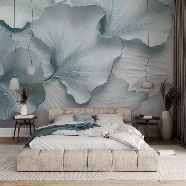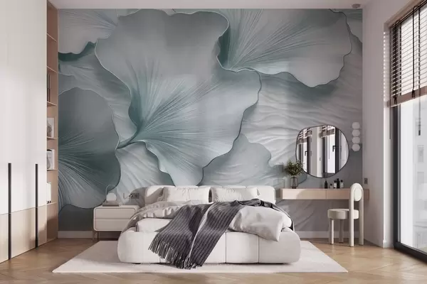 Papel tapiz Pétalos de hojas de ginkgo texturizados, azules y blancos, con un delicado estampado orgánico. Nr. w09741v1