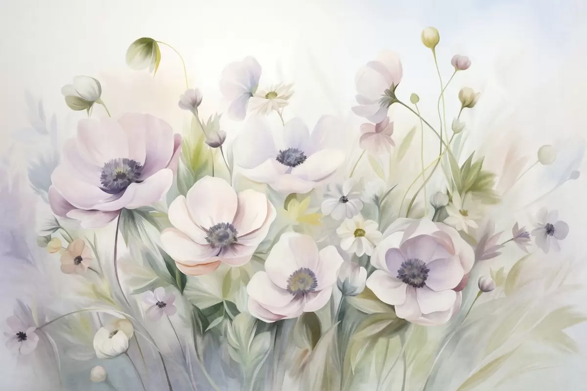 Papel tapiz Un campo de flores de anémona en tonos rosa pastel y blanco, follaje verde y pequeñas margaritas blancas. Nr. w09742