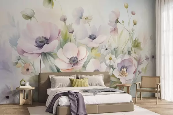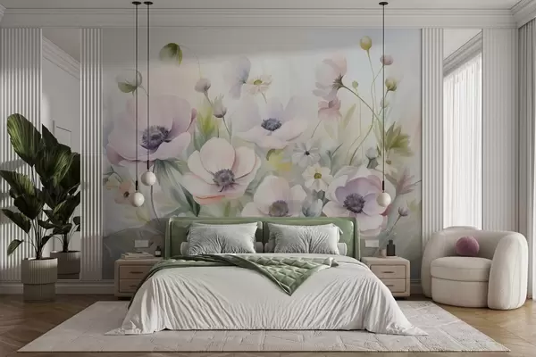 Papel tapiz Un campo de flores de anémona en tonos rosa pastel y blanco, follaje verde y pequeñas margaritas blancas. Nr. w09742