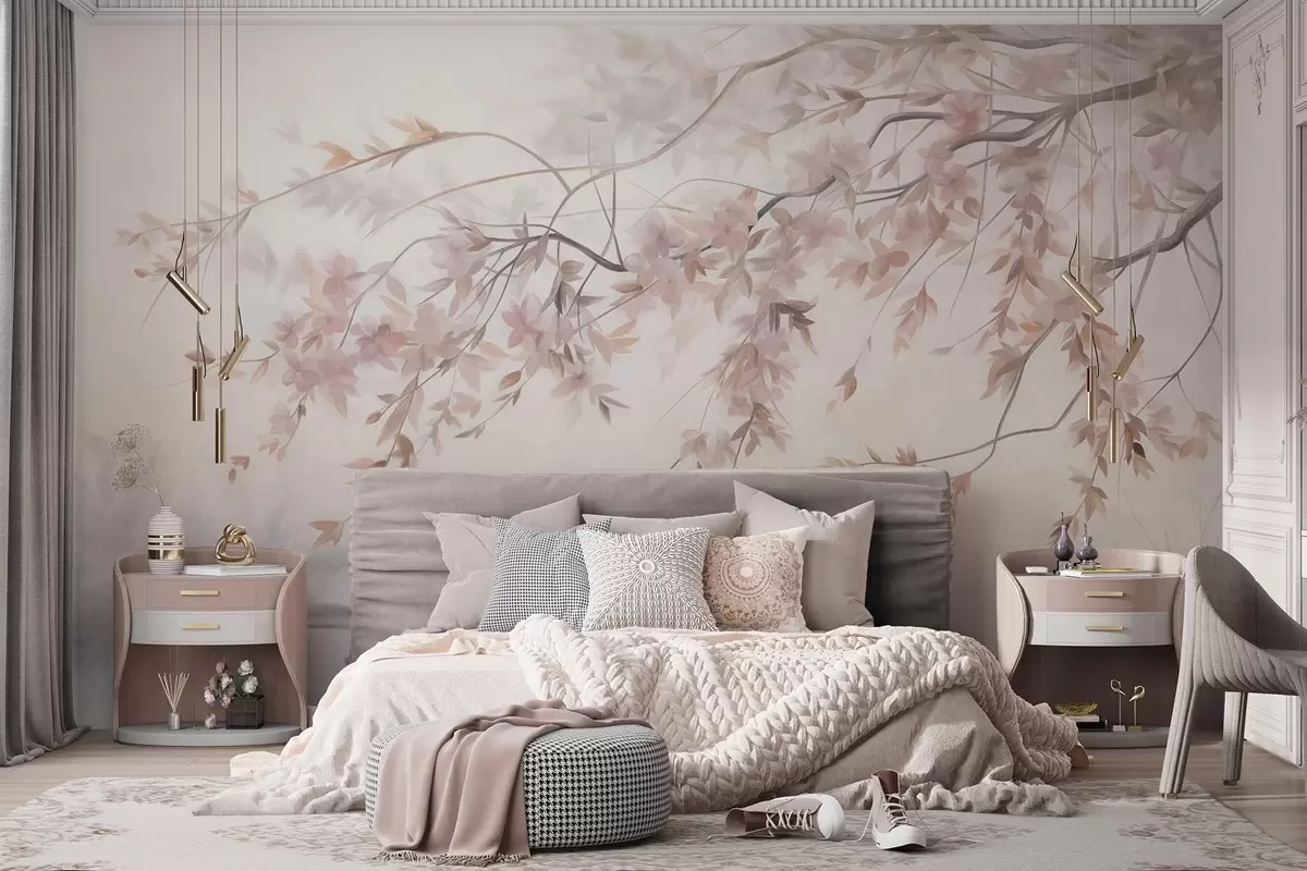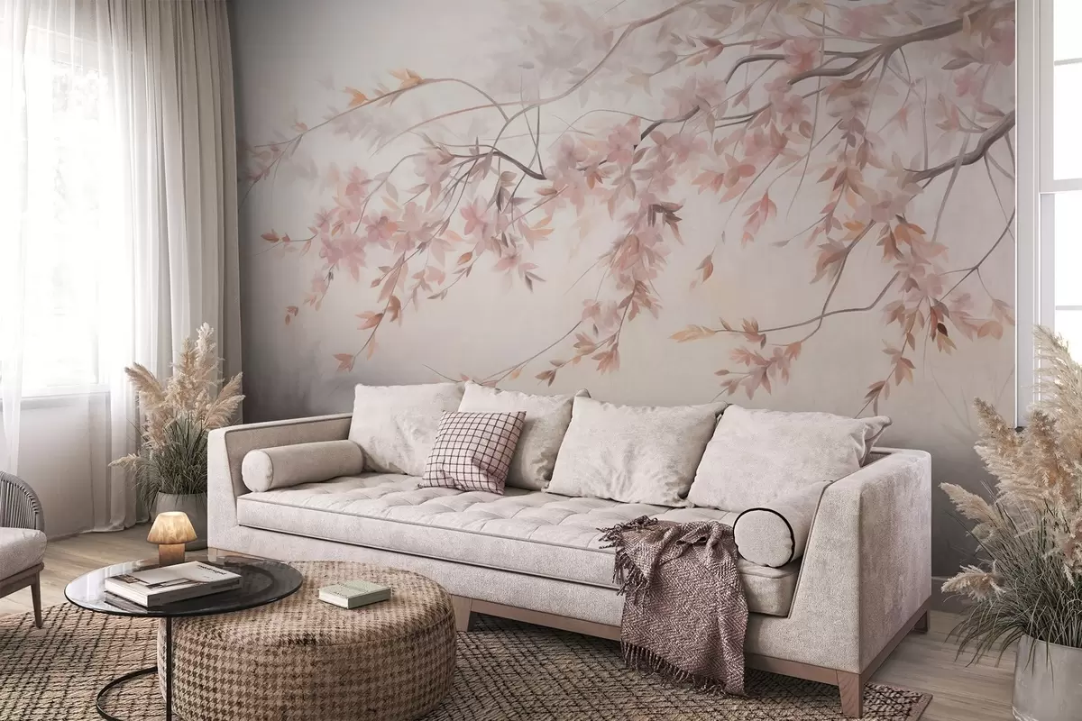 Papel tapiz Paisaje texturizado con rama de cerezo en flor, hojas rosadas y fondo suave y brumoso. Nr. w09743