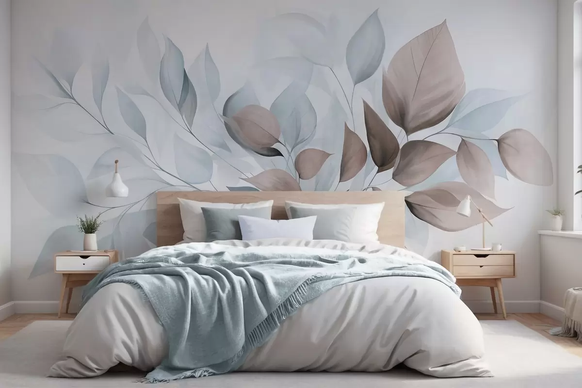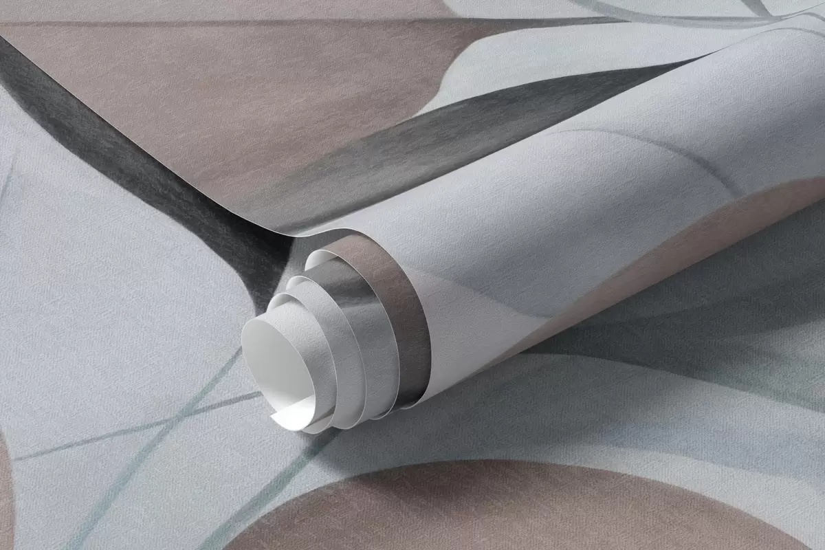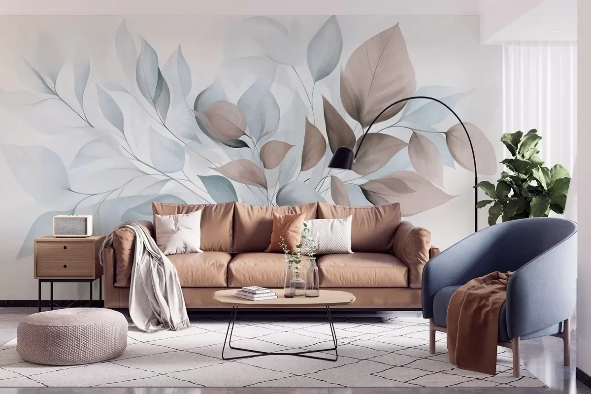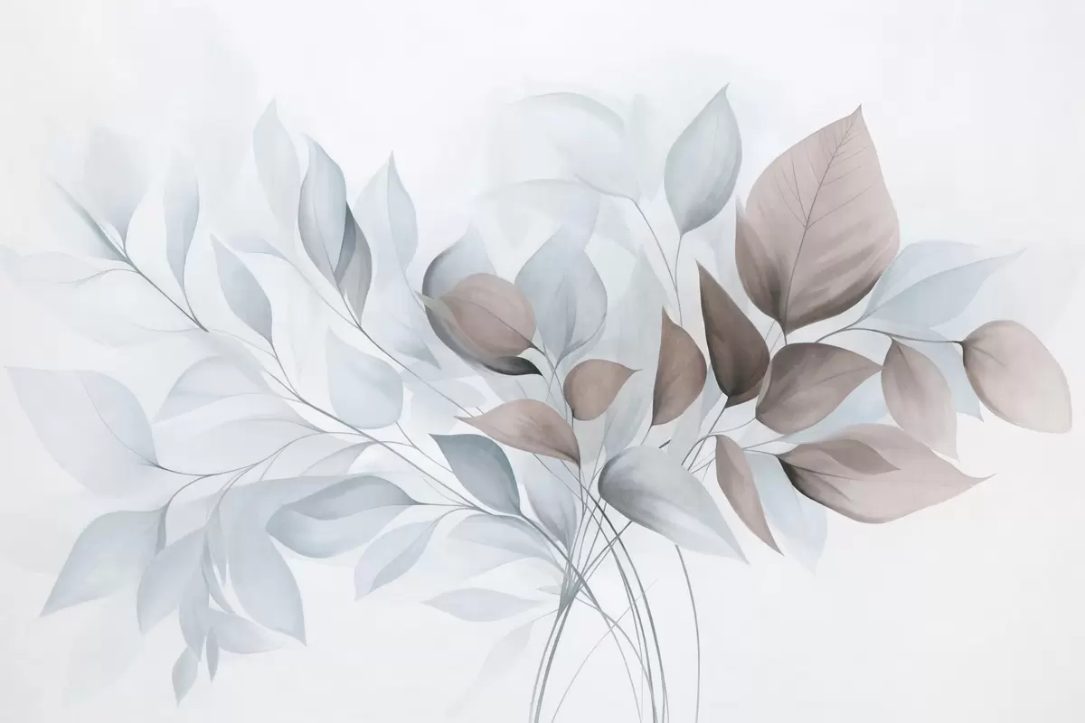 Papel tapiz Hojas abstractas translúcidas en tonos azules, beige y marrones, arte texturizado. Nr. w09744v1