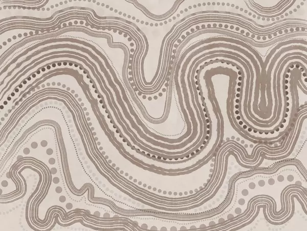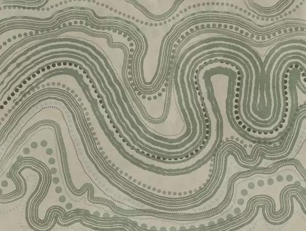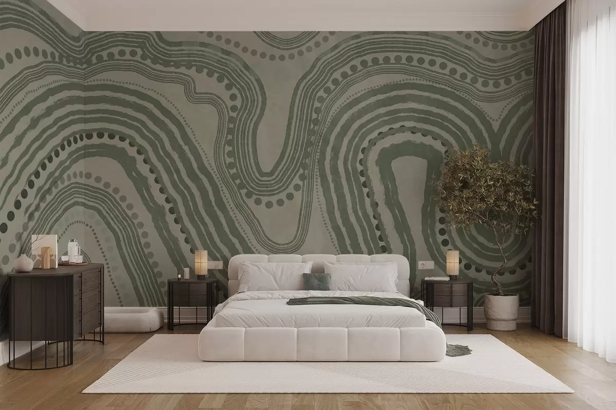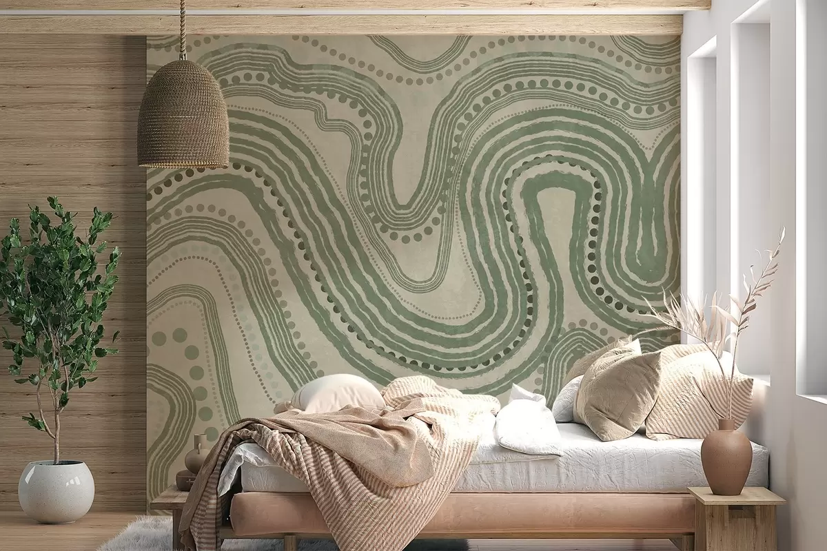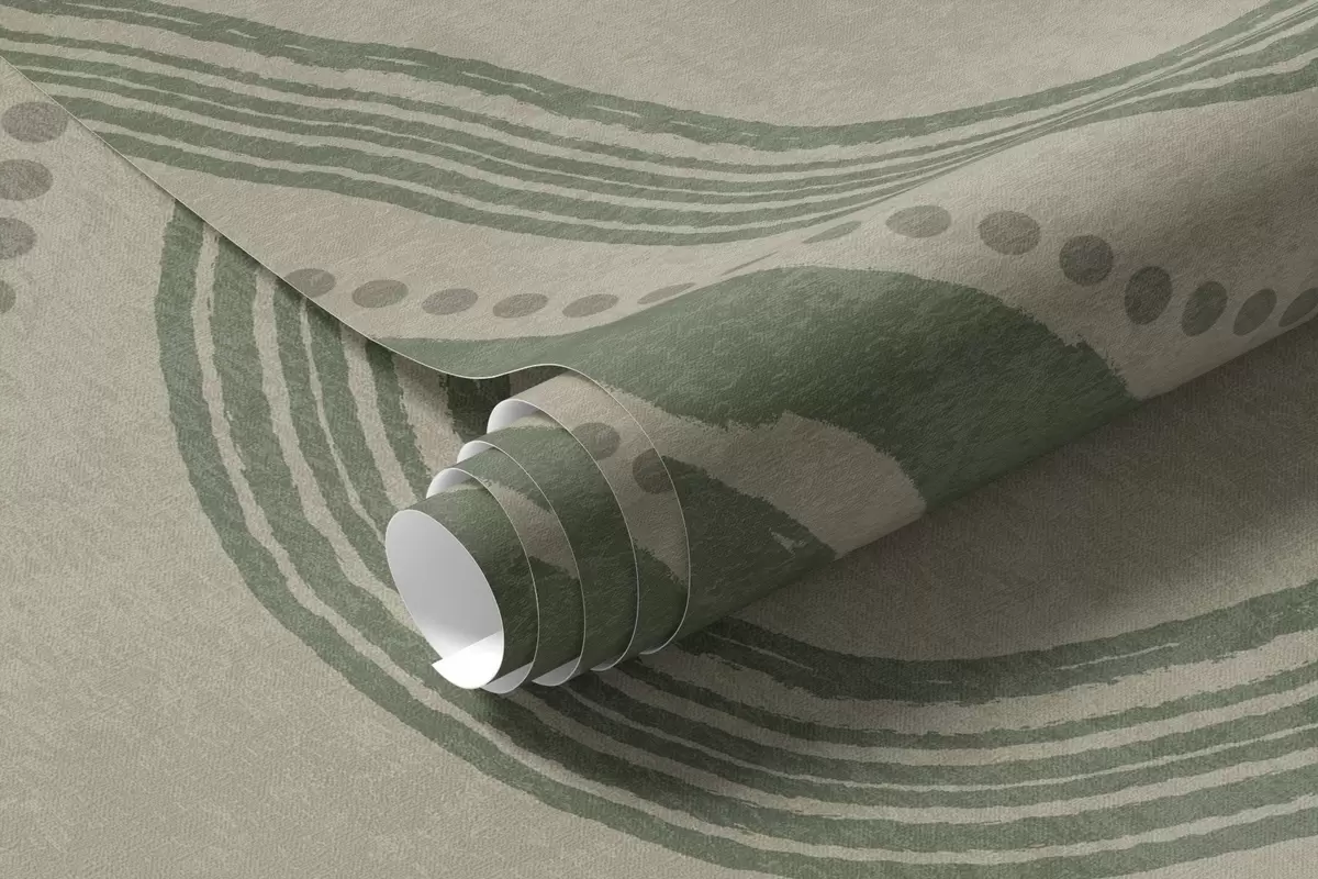 Papel tapiz Líneas onduladas y puntos abstractos en verde y beige, arte moderno con textura. Nr. w09747