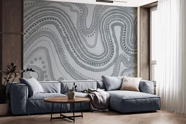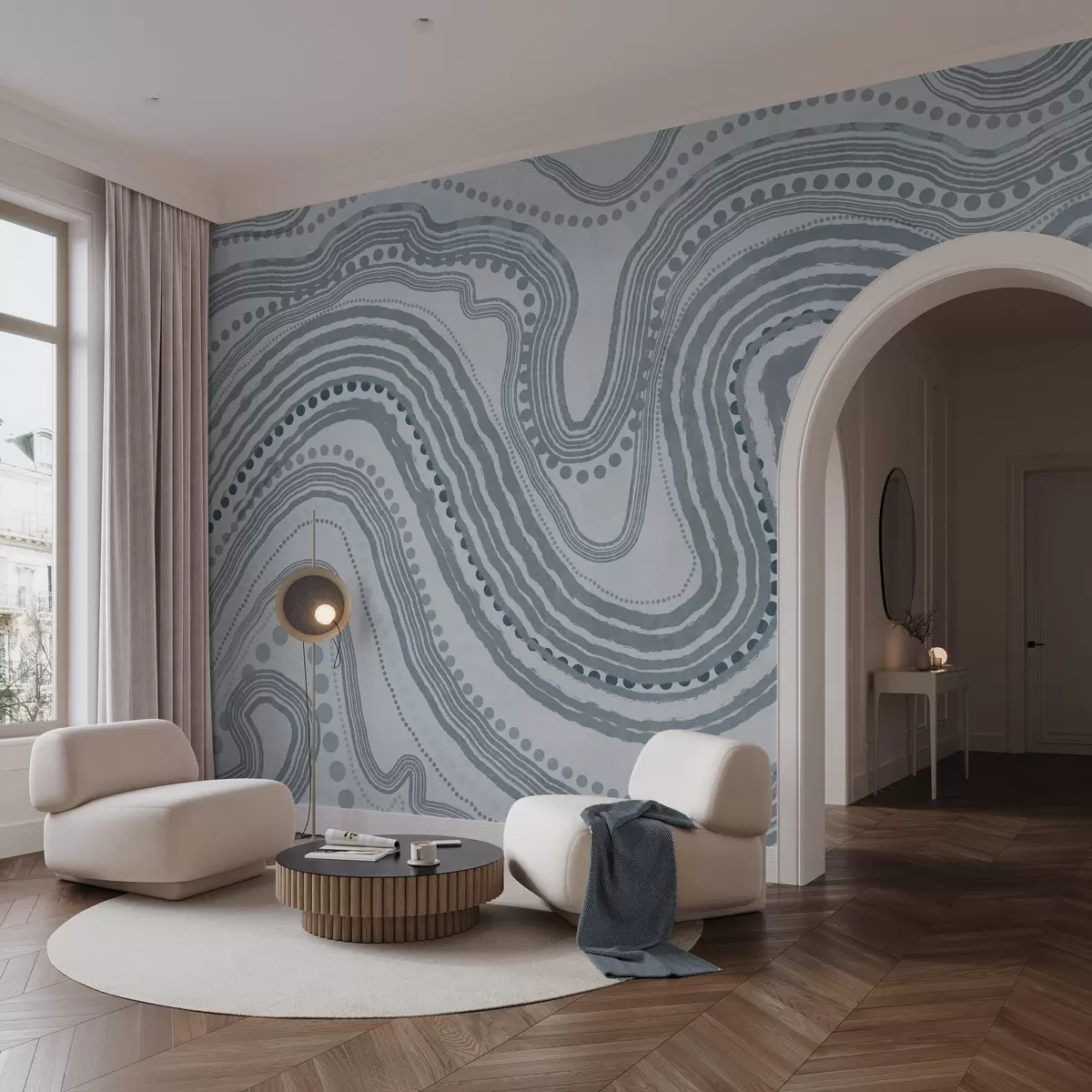 Papel tapiz Líneas onduladas y puntos azules abstractos, arte moderno con textura. Nr. w09747v3