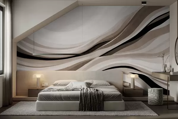 Papel tapiz Líneas onduladas abstractas en tonos beige y negro sobre un fondo claro, arte texturizado. Nr. w09748