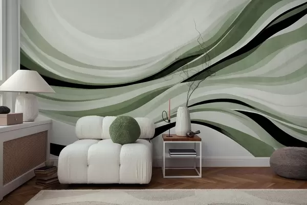 Papel tapiz Líneas onduladas abstractas en tonos verdes y negros sobre un fondo claro, arte texturizado. Nr. w09748v1