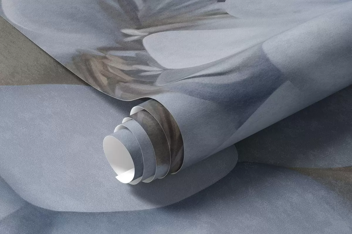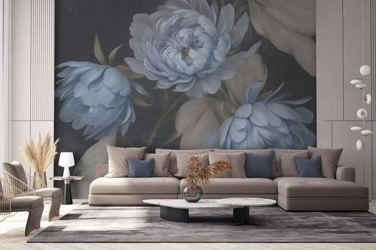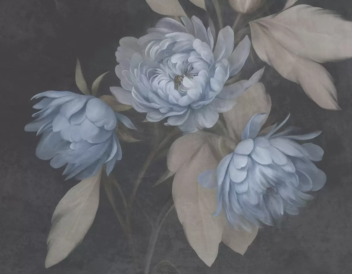 Papel tapiz Flores de peonía azul claro con textura y hojas de color beige sobre un fondo oscuro Nr. w09751