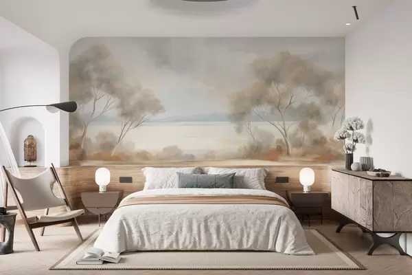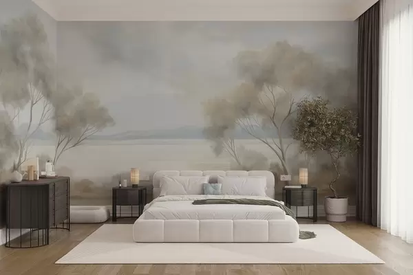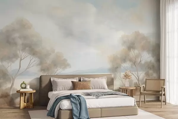 Papel tapiz Un estilo de pintura con textura paisajística con árboles bajo un cielo nublado. Nr. w09753