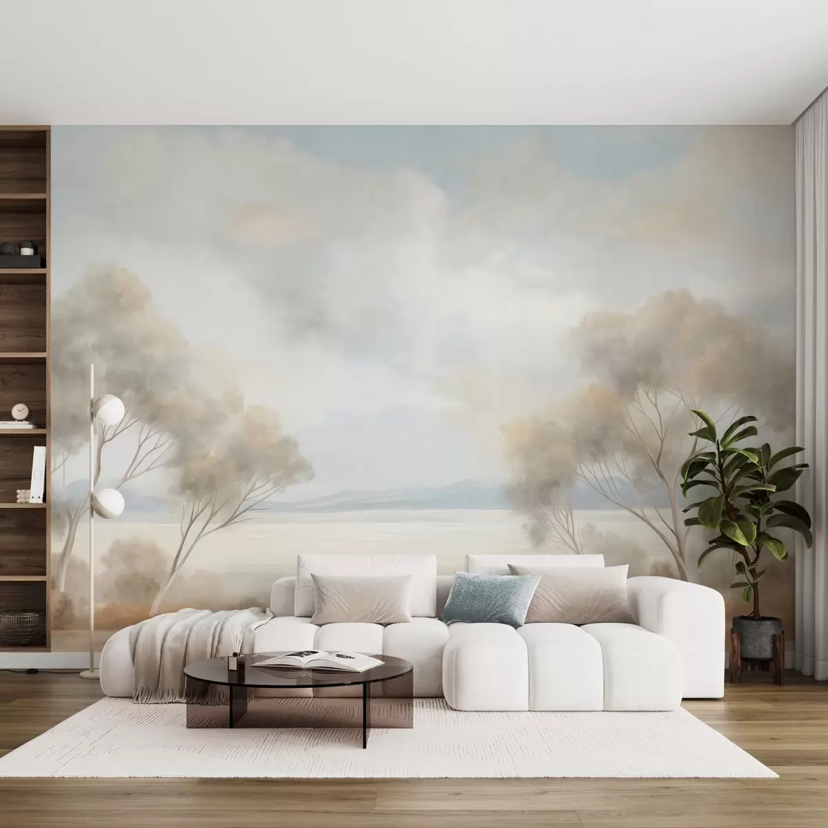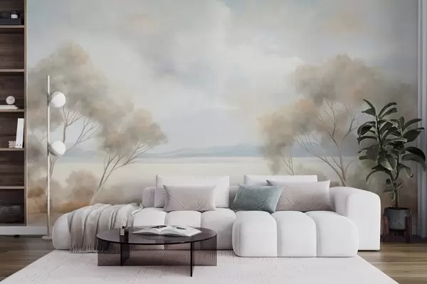 Papel tapiz Un estilo de pintura con textura paisajística con árboles bajo un cielo nublado. Nr. w09753