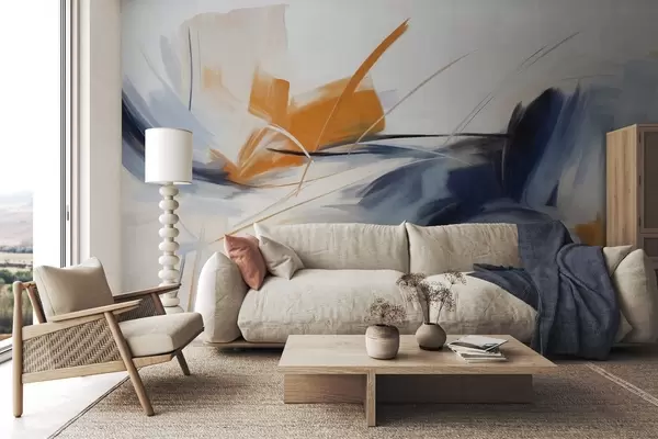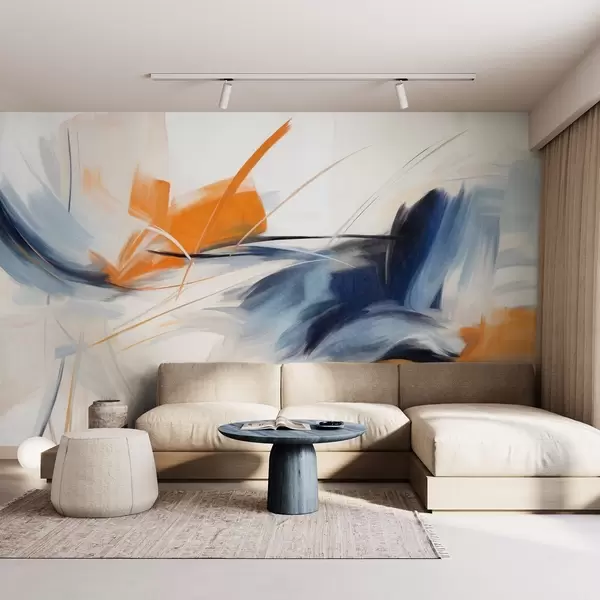 Papel tapiz Estilo de pintura abstracta con pinceladas texturizadas en naranja y azul. Nr. w09755