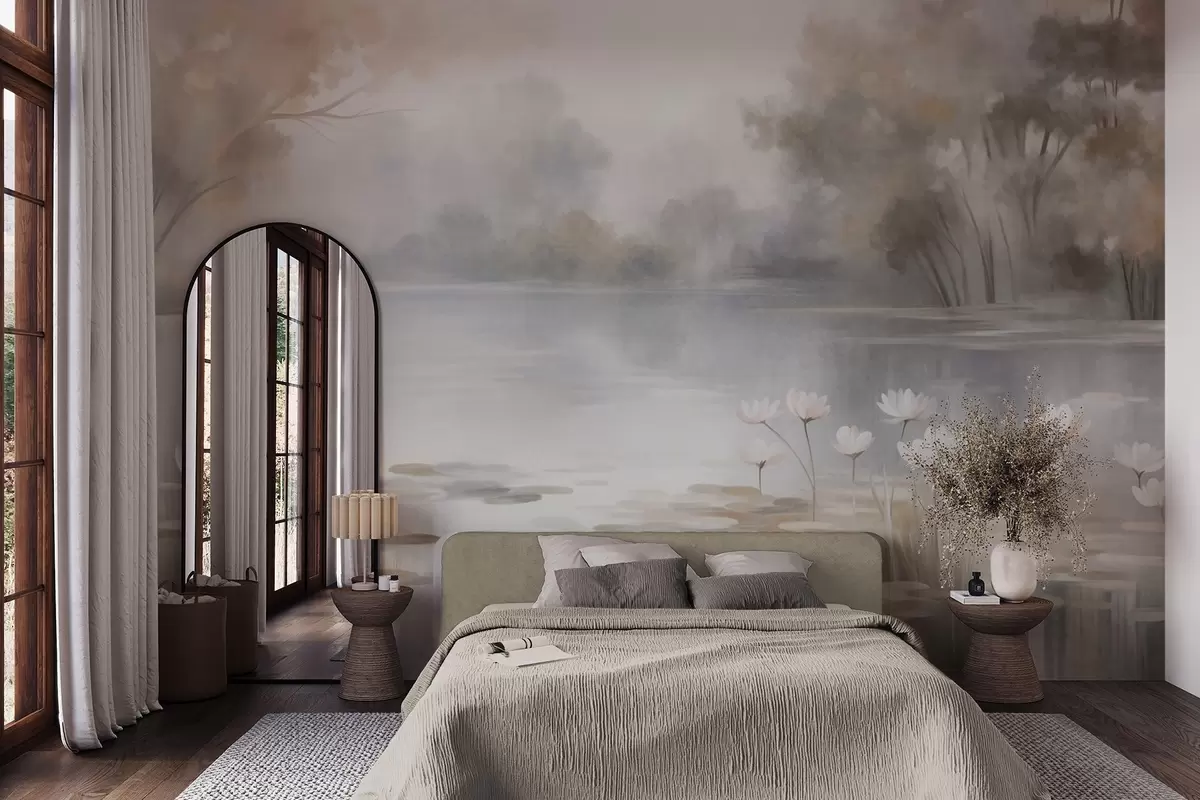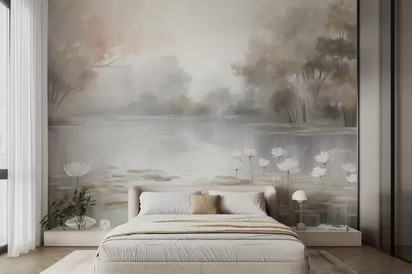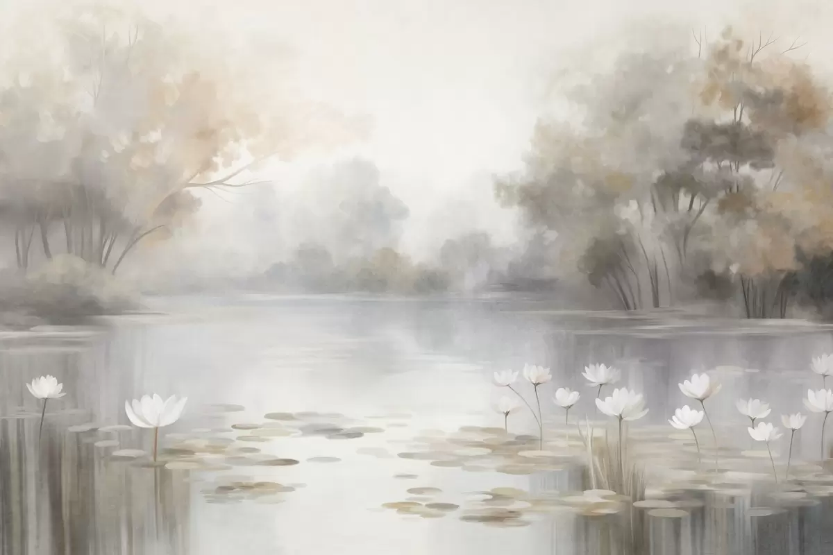 Papel tapiz Paisaje con relieve, lago con nenúfares blancos, rodeado de árboles de colores tenues Nr. w09768
