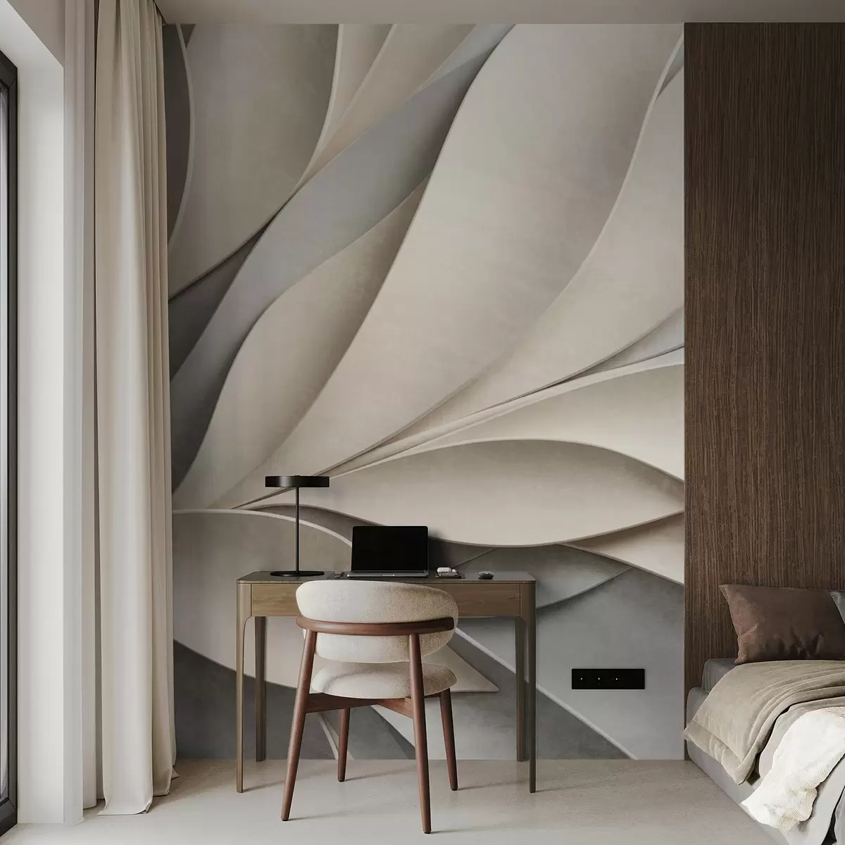Papel tapiz Hojas abstractas en beige y gris, arte moderno con textura. Nr. w09769
