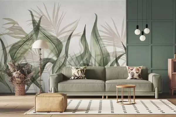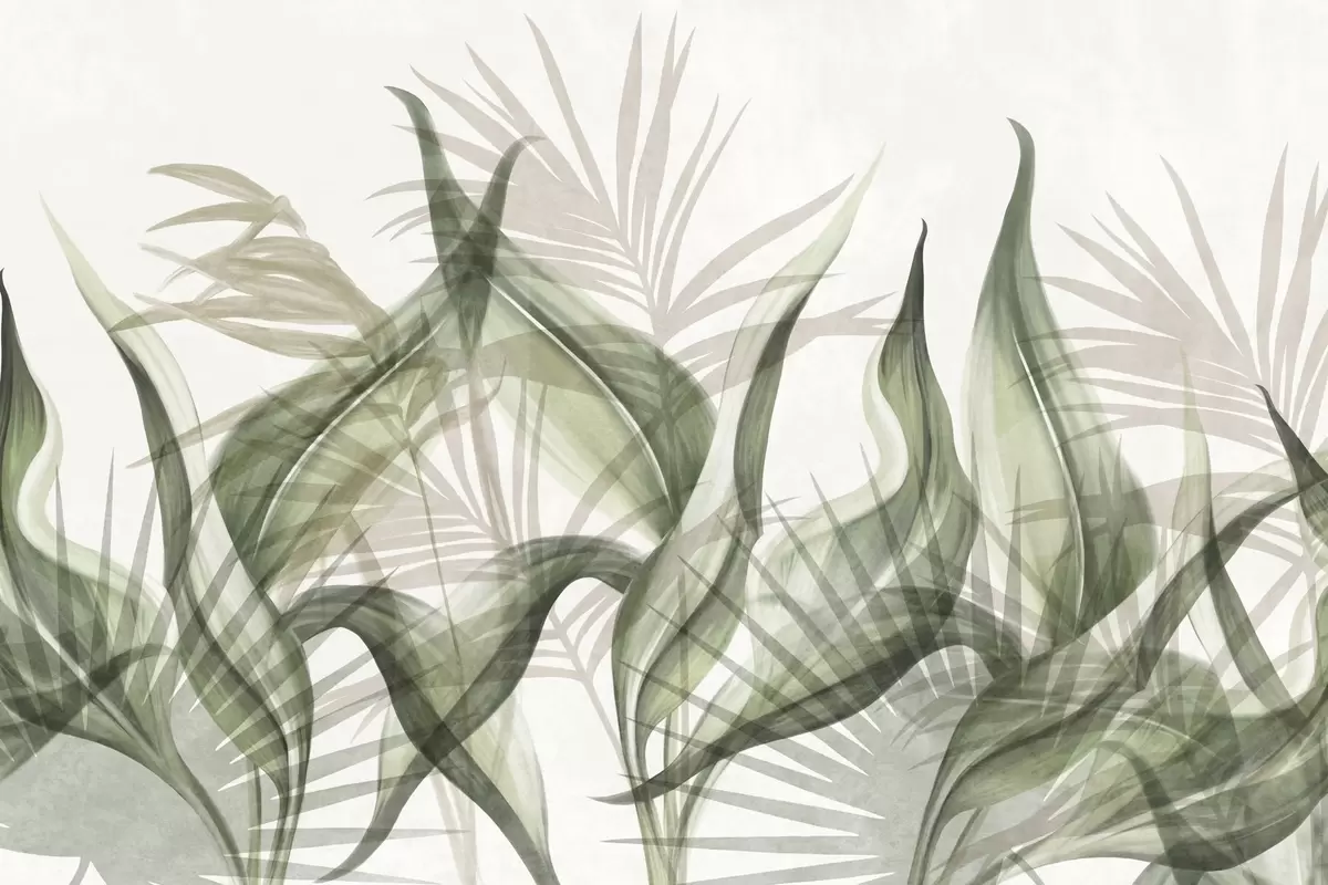 Papel tapiz Hojas tropicales en tonos beige y verde sobre fondo blanco, estilo acuarela con textura. Nr. w09772v1