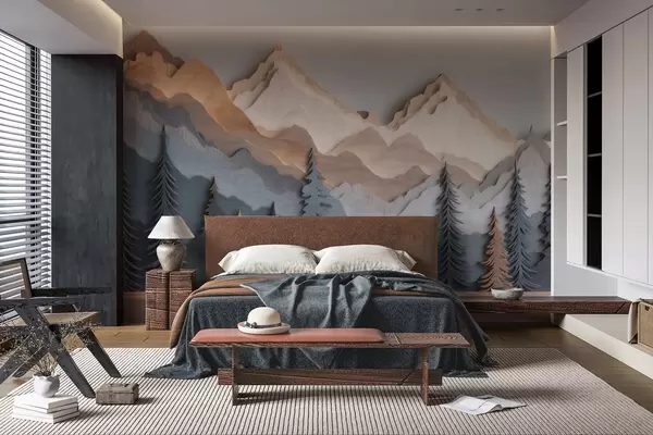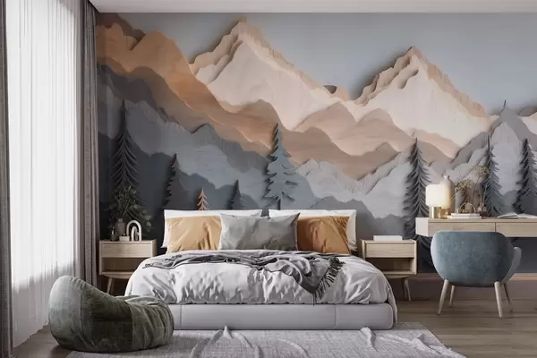 Papel tapiz Paisaje natural con pinos y montañas, en estilo de madera tallada Nr. w09793