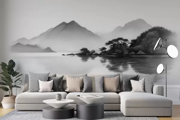 Papel tapiz Paisaje en blanco y negro con montañas y un lago envueltos en una suave niebla Nr. w09803