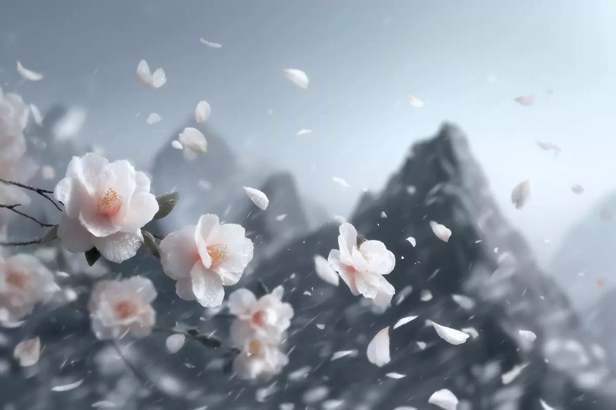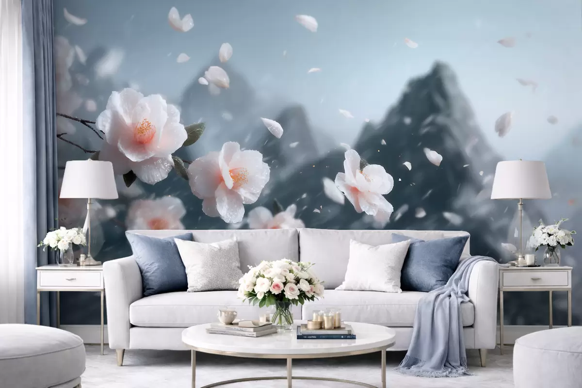 Papel tapiz Delicadas flores de cerezo con las montañas de fondo; evocador paisaje japonés en tonos pastel Nr. w09808