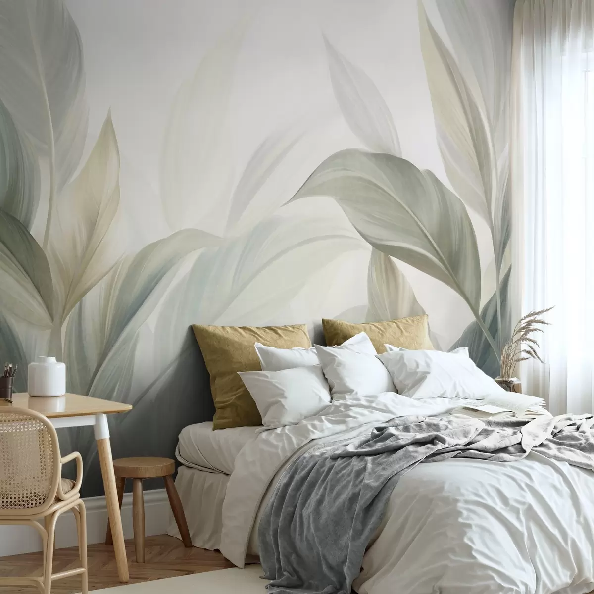 Papel tapiz Hojas tropicales grandes de color verde pálido con tonos suaves y pasteles, obra de arte con textura Nr. w09816