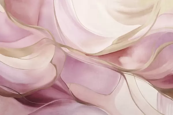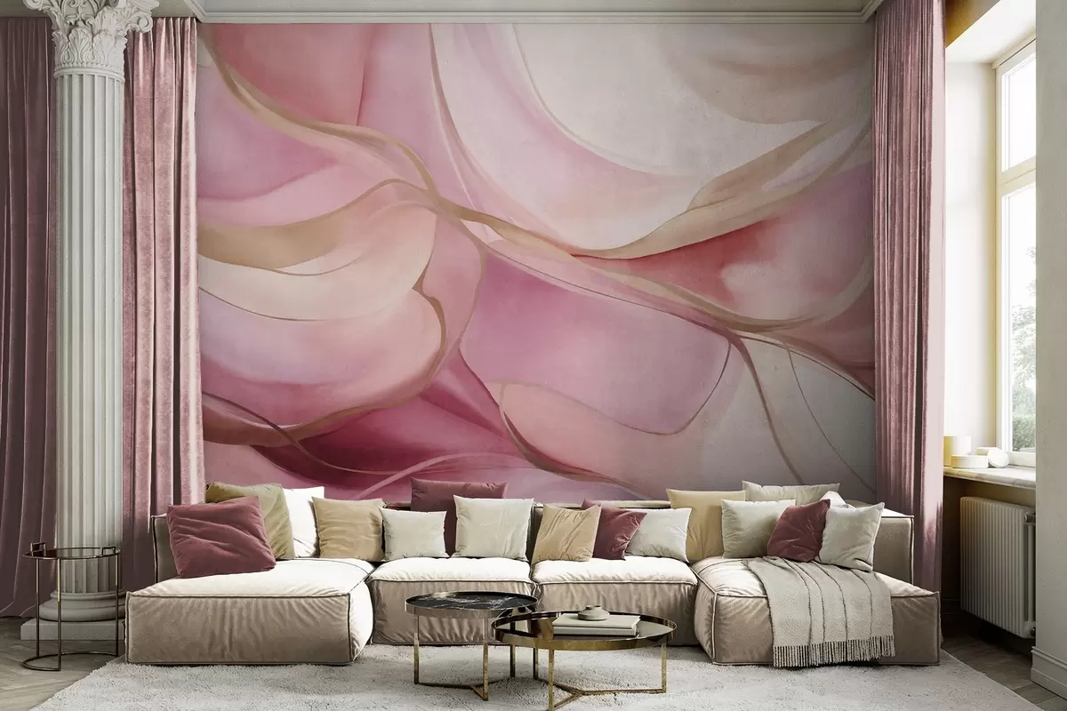 Papel tapiz Formas fluidas con texturas abstractas en tonos rosa y beige, con delicadas líneas amarillas Nr. w09818