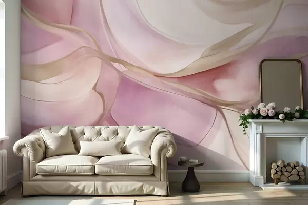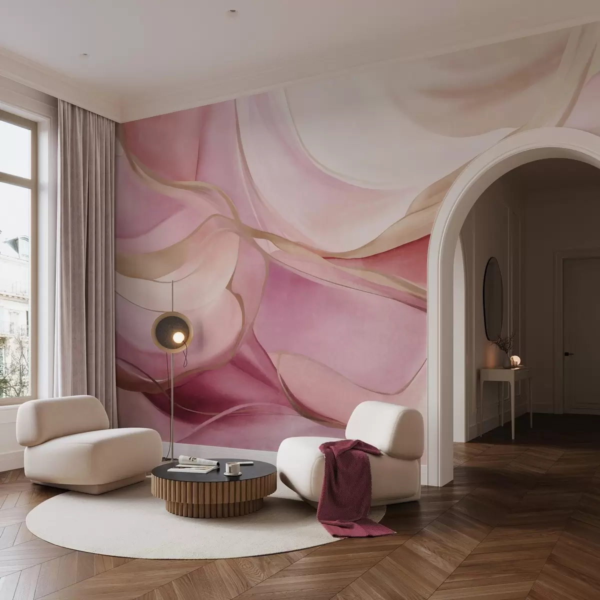 Papel tapiz Formas fluidas con texturas abstractas en tonos rosa y beige, con delicadas líneas amarillas Nr. w09818