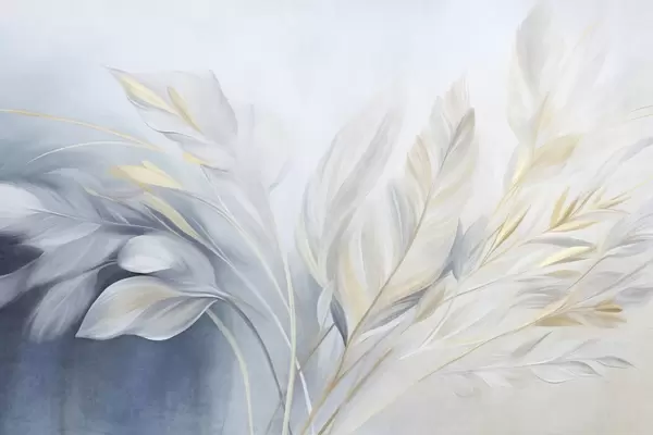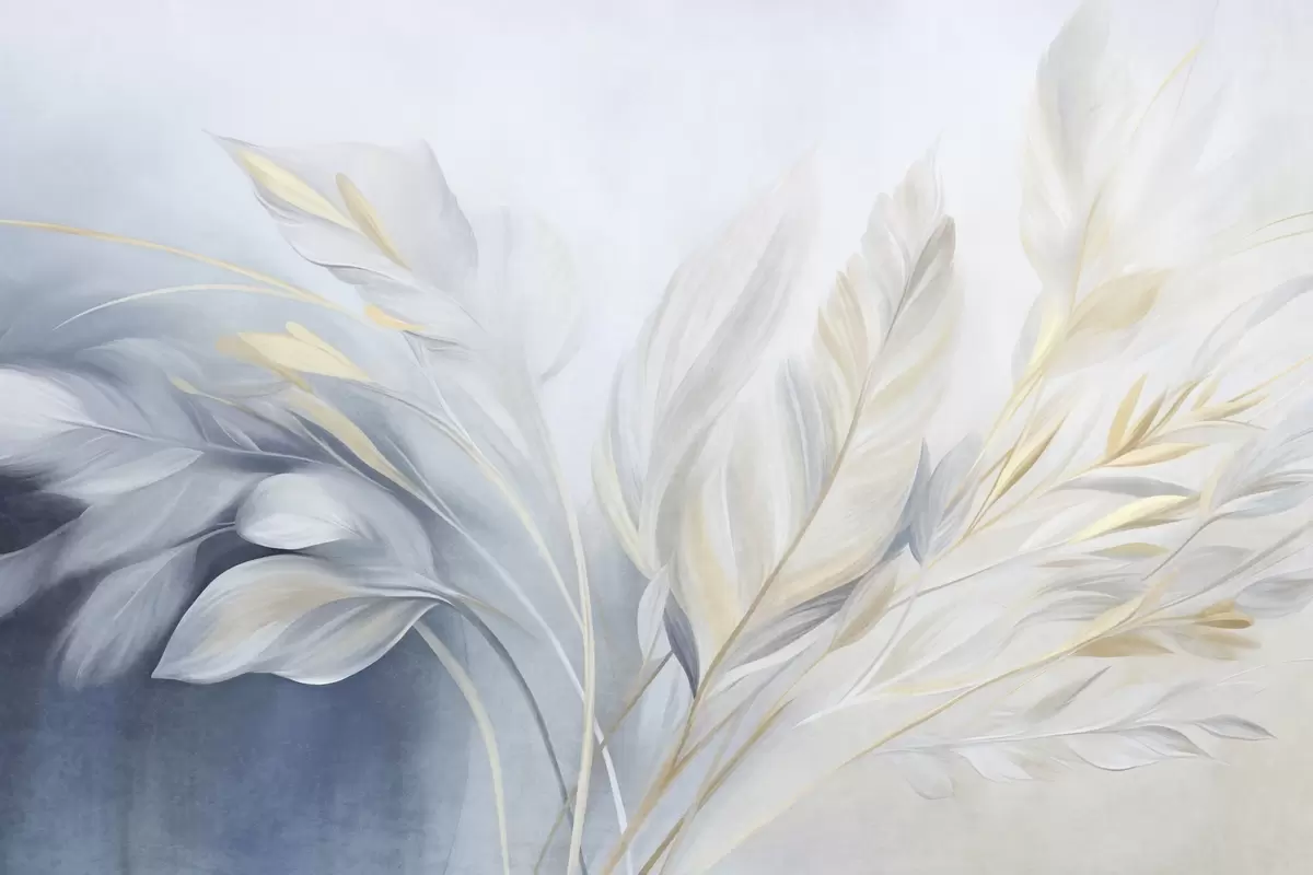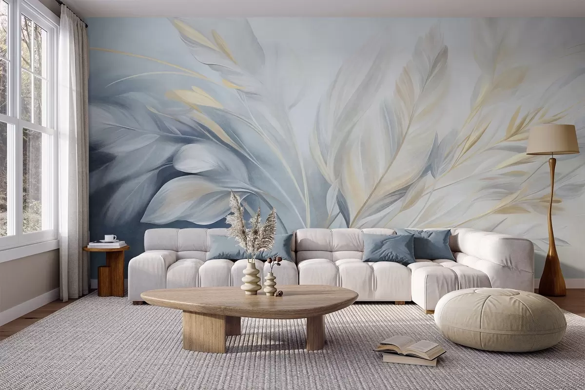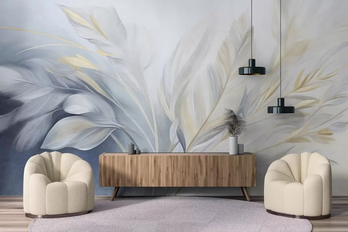 Papel tapiz Plumas con textura y detalles en amarillo, sobre un fondo suave de azul claro y blanco Nr. w09826