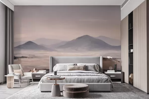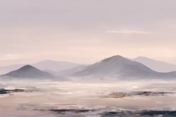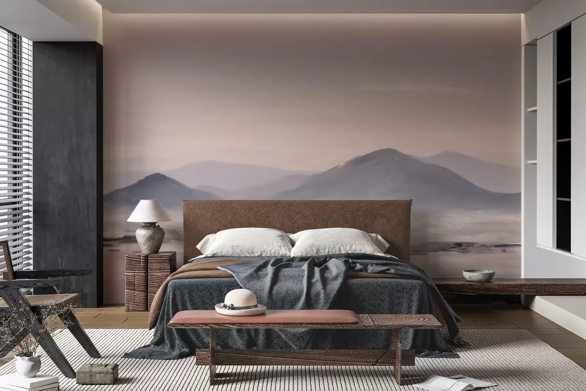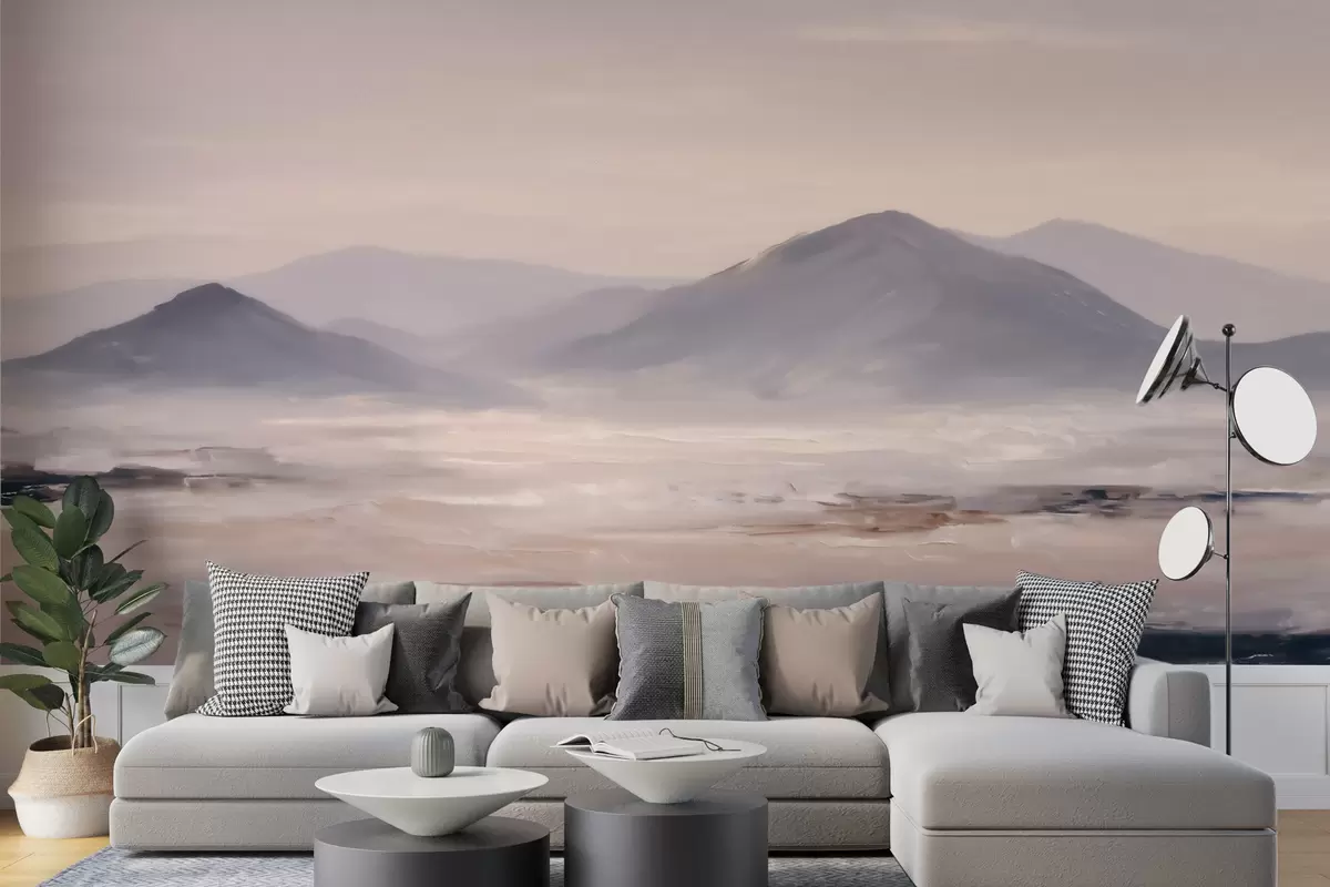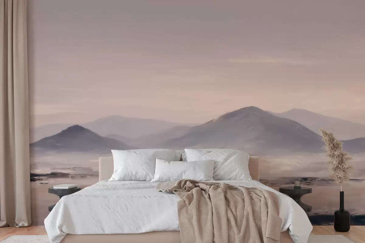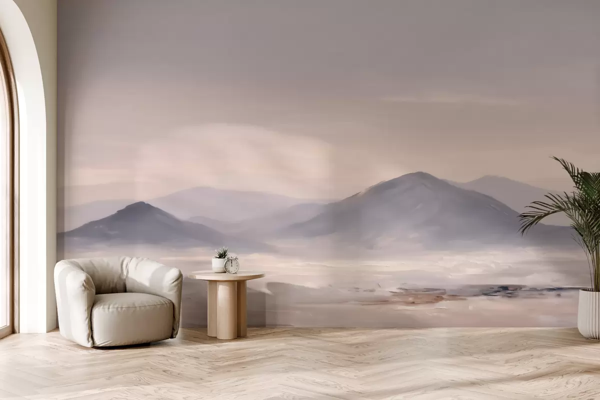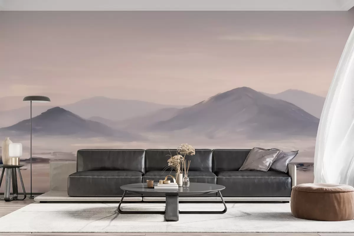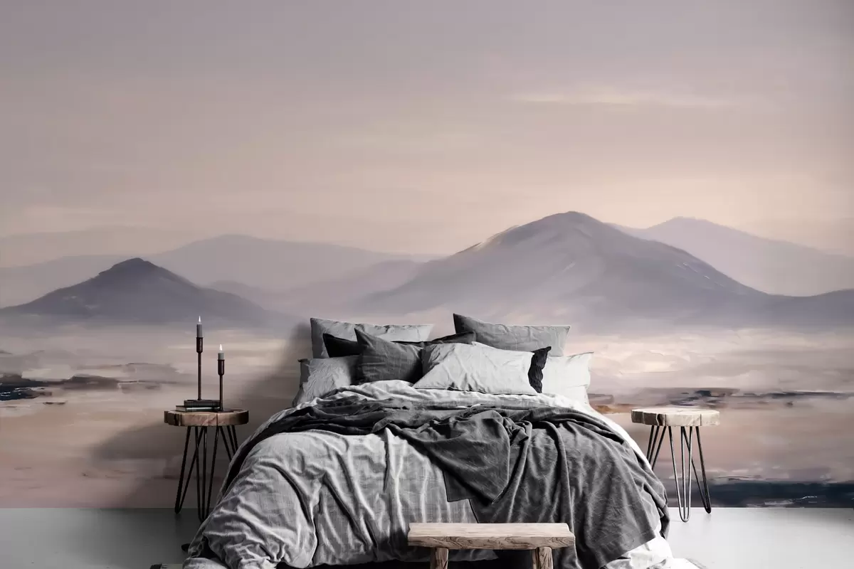 Papel tapiz Un paisaje montañoso envuelto en niebla, con suaves transiciones de luz y aire, y un efecto similar al de una máscara Nr. w09844