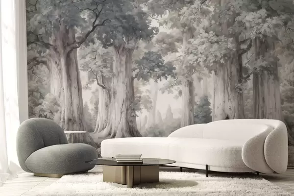 Papel tapiz Un bosque de cuento de hadas con árboles altos y una paleta de colores suaves y tenues, al estilo de la acuarela Nr. w09849